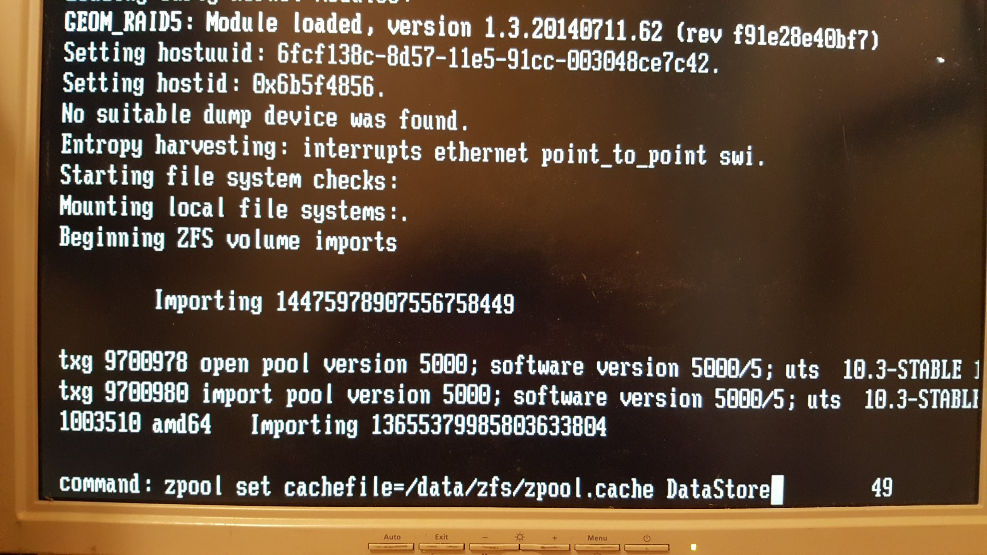 I've been running FreeNAS for years on a Isolon device. It crashed unexpectedly and will not come up, it gets stuck importing one of the zpools. At least that's what it looks like it's doing . I attached a screen shot of the console.