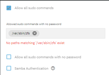 First question here would be: I was not prompted for my root password yet. From what I gathered Use Sudo for ZFS Commands should be checked if I have not setup passwordless sudo. I did not change the configuration to the default core root user yet. Is this correct?