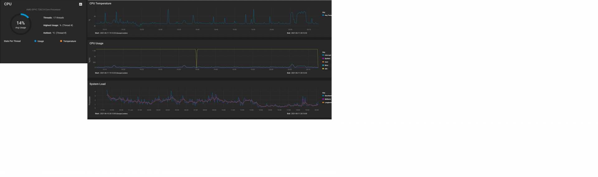Hi Guys I upgraded my nas to Epyc 7262 with nice ROMED6U-2L2T mobo.Everything is lighting speed I only got 1 issue on dashboard its missing cpu usage % temp and thread number is show as 17 its showing graphs on reporting tab ok.This is common issue with epyc second gen ?or its some bug as I restore my config from my previous Xeon D-2143NT.(tbh i didnt pay attention is dashboard was working ok before restore settings)
