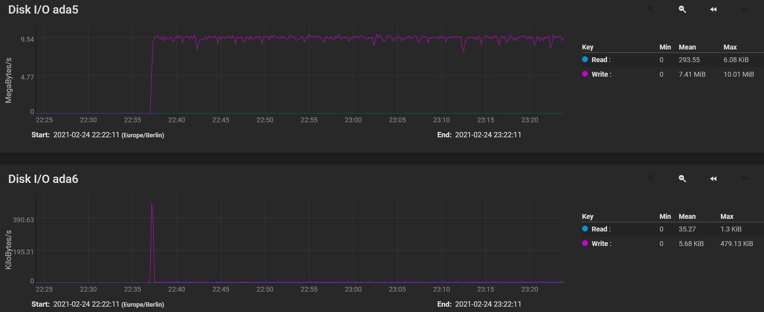 In the moment I am writing data on this pool. The smallest disc shows "some" activity, but only minimal transfer rates. Before the data transfer appeared to be equal regarding to the speed of the single discs. Does it look like this, when the disc is full? See attachment.