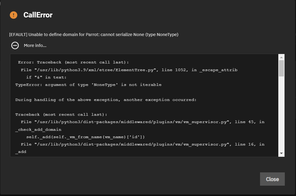 Ok so i installed Parrot OS on Truenas and it worked great for the first day but after i restarted my truenas server i get this call error when trying to start the VM