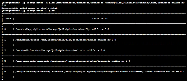 replace space by \040 when you add it iocage fstab -a JAIL /mnt/media/transcode /config/Plex\040Media\040Server/Cache/Transcode nullfs rw 0 0