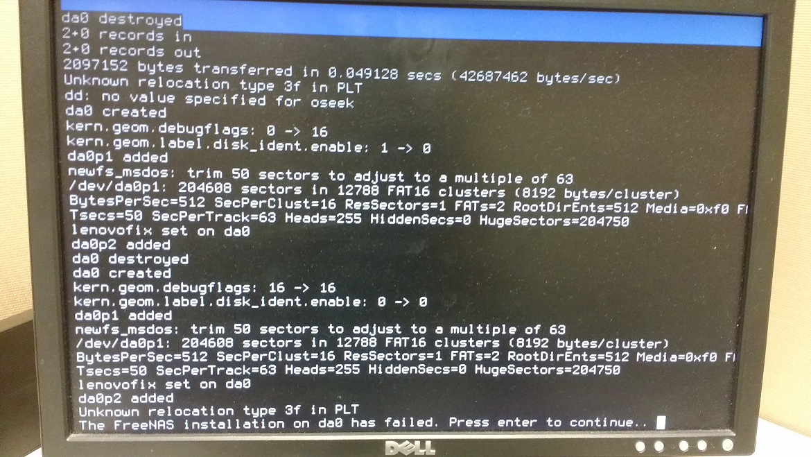 I am new to this forum. I have used FreeNAS 8.0 in the past. I tried installing FreeNAS 9.10.1-U2 on an old Dell R710 server which has a SAS 6 IR hba card and has 6 SATA drives on the backplane of 2 TB each. It has 12gb DIMM, 2 dual Xeon processor of 2ghz each, 4 Ethernet ports. Server is old but in good condition. Sata drives are brand new. There is no RAID configuration. Every time I try installing FreeNAS the installer aborts giving the message Unknown relocation type 3f in PLT. I just don't know how to move ahead. Can anybody help me sort out this problem?