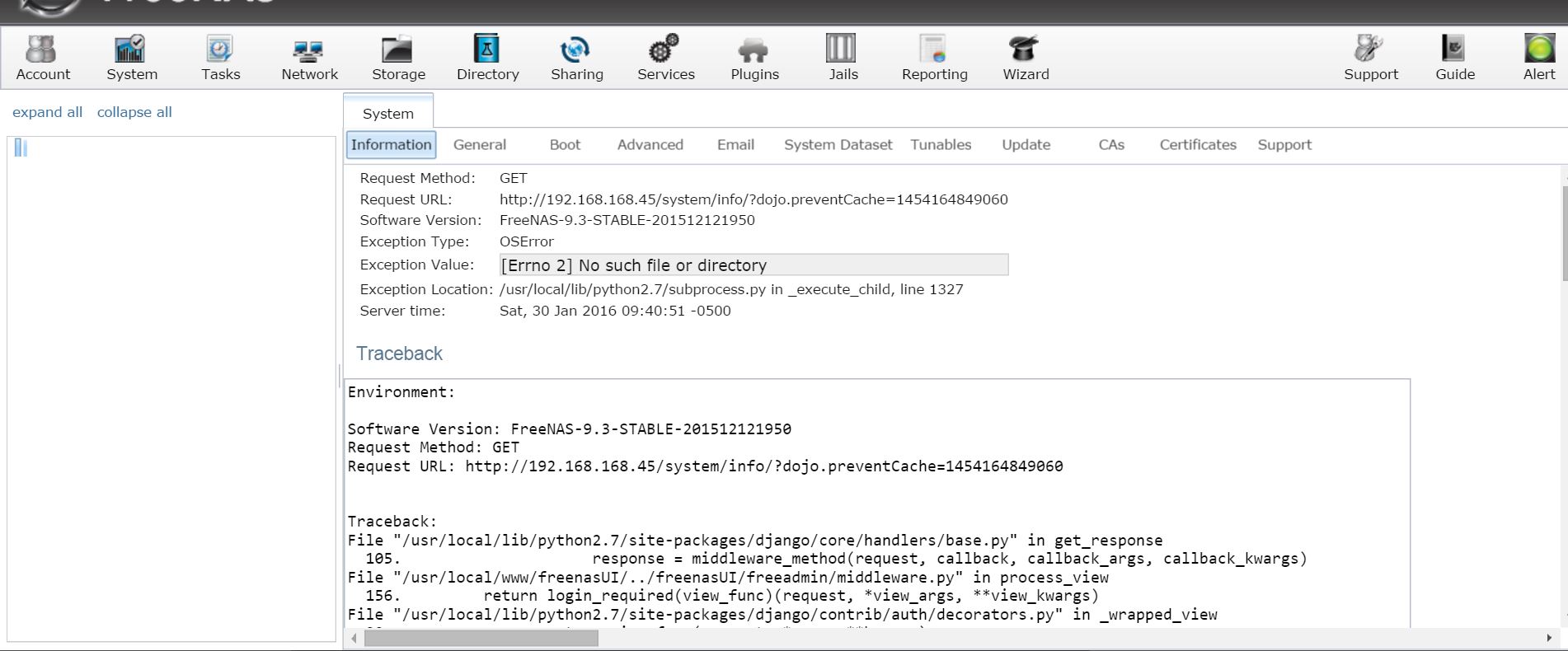 Request Method: GET Request URL: http://192.168.1.45/system/info/?dojo.preventCache=1454164658342 Software Version: FreeNAS-9.3-STABLE-201512121950 Exception Type: OSError Exception Value: [Errno 2] No such file or directory Exception Location: /usr/local/lib/python2.7/subprocess.py in _execute_child, line 1327 Server time: Sat, 30 Jan 2016 09:37:40 -0500 Traceback Request information GET Variable Value dojo.preventCache u'1454164658342' POST No POST data FILES No FILES data COOKIES Variable Value csrftoken '4p0bY7s1O93rHu0iazklrjY2uL6ieEaE' fntreeSaveStateCookie 'root%2Croot%2F188%2Croot%2F191%2F197%2F199%2Croot%2F191%2F207%2Croot%2F132%2Croot%2F38%2Croot%2F189%2Croot%2F191%2Croot%2F195%2Croot%2F193%2Croot%2F55%2Croot%2F55%2F56%2Croot%2F55%2F56%2F57%2Croot%2F55%2F56%2F57%2F58%2Croot%2F55%2F56%2F57%2F58%2F83%2Croot%2F55%2F56%2F57%2F58%2F87%2Croot%2F174%2Croot%2F137%2Croot%2F137%2F147%2Croot%2F56%2F57%2Croot%2F56%2F57%2F58%2Croot%2F1%2Croot%2F1%2F6%2Croot%2F1%2F2%2Croot%2F201%2Croot%2F201%2F213%2F215%2Croot%2F201%2F217%2Croot%2F201%2F207%2Croot%2F201%2F207%2F209%2Croot%2F217%2F242%2Croot%2F217%2F247%2Croot%2F217%2F247%2F249%2Croot%2F217%2F237%2Croot%2F217%2F223%2Croot%2F212' sessionid 'ncuohjwxb4kfbo7pgryv9s0b9cnwxxmp' META Variable Value wsgi.run_once False wsgi.version (1, 0) DOCUMENT_ROOT '/usr/local/etc/nginx/html' REMOTE_PORT '55015' SERVER_NAME 'localhost' HTTP_ACCEPT '*/*' HTTPS '' wsgi.url_scheme 'http' SERVER_ADDR '192.168.168.45' REDIRECT_STATUS '200' wsgi.multiprocess False HTTP_CONNECTION 'keep-alive' REQUEST_METHOD 'GET' SERVER_PORT '80' REMOTE_ADDR '192.168.168.155' wsgi.errors <flup.server.fcgi_base.TeeOutputStream object at 0x8142e2ed0> HTTP_ACCEPT_ENCODING 'gzip, deflate, sdch' wsgi.input <flup.server.fcgi_base.InputStream object at 0x8142e2590> SCRIPT_NAME u'' HTTP_USER_AGENT 'Mozilla/5.0 (Windows NT 6.3; WOW64) AppleWebKit/537.36 (KHTML, like Gecko) Chrome/48.0.2564.97 Safari/537.36' HTTP_REFERER 'http://192.168.1.45/' SERVER_SOFTWARE 'nginx/1.6.2' HTTP_COOKIE 'sessionid=ncuohjwxb4kfbo7pgryv9s0b9cnwxxmp; fntreeSaveStateCookie=root%2Croot%2F188%2Croot%2F191%2F197%2F199%2Croot%2F191%2F207%2Croot%2F132%2Croot%2F38%2Croot%2F189%2Croot%2F191%2Croot%2F195%2Croot%2F193%2Croot%2F55%2Croot%2F55%2F56%2Croot%2F55%2F56%2F57%2Croot%2F55%2F56%2F57%2F58%2Croot%2F55%2F56%2F57%2F58%2F83%2Croot%2F55%2F56%2F57%2F58%2F87%2Croot%2F174%2Croot%2F137%2Croot%2F137%2F147%2Croot%2F56%2F57%2Croot%2F56%2F57%2F58%2Croot%2F1%2Croot%2F1%2F6%2Croot%2F1%2F2%2Croot%2F201%2Croot%2F201%2F213%2F215%2Croot%2F201%2F217%2Croot%2F201%2F207%2Croot%2F201%2F207%2F209%2Croot%2F217%2F242%2Croot%2F217%2F247%2Croot%2F217%2F247%2F249%2Croot%2F217%2F237%2Croot%2F217%2F223%2Croot%2F212; csrftoken=4p0bY7s1O93rHu0iazklrjY2uL6ieEaE' HTTP_CONTENT_TYPE 'application/x-www-form-urlencoded' HTTP_ACCEPT_LANGUAGE 'en-US,en;q=0.8' CONTENT_TYPE 'application/x-www-form-urlencoded' DOCUMENT_URI '/system/info/' wsgi.multithread True HTTP_HOST '192.168.1.45' PATH_INFO u'/system/info/' REQUEST_URI '/system/info/?dojo.preventCache=1454164658342' HTTP_X_REQUESTED_WITH 'XMLHttpRequest' SERVER_PROTOCOL 'HTTP/1.1' QUERY_STRING 'dojo.preventCache=1454164658342' CSRF_COOKIE u'4p0bY7s1O93rHu0iazklrjY2uL6ieEaE' CONTENT_LENGTH '' GATEWAY_INTERFACE 'CGI/1.1'