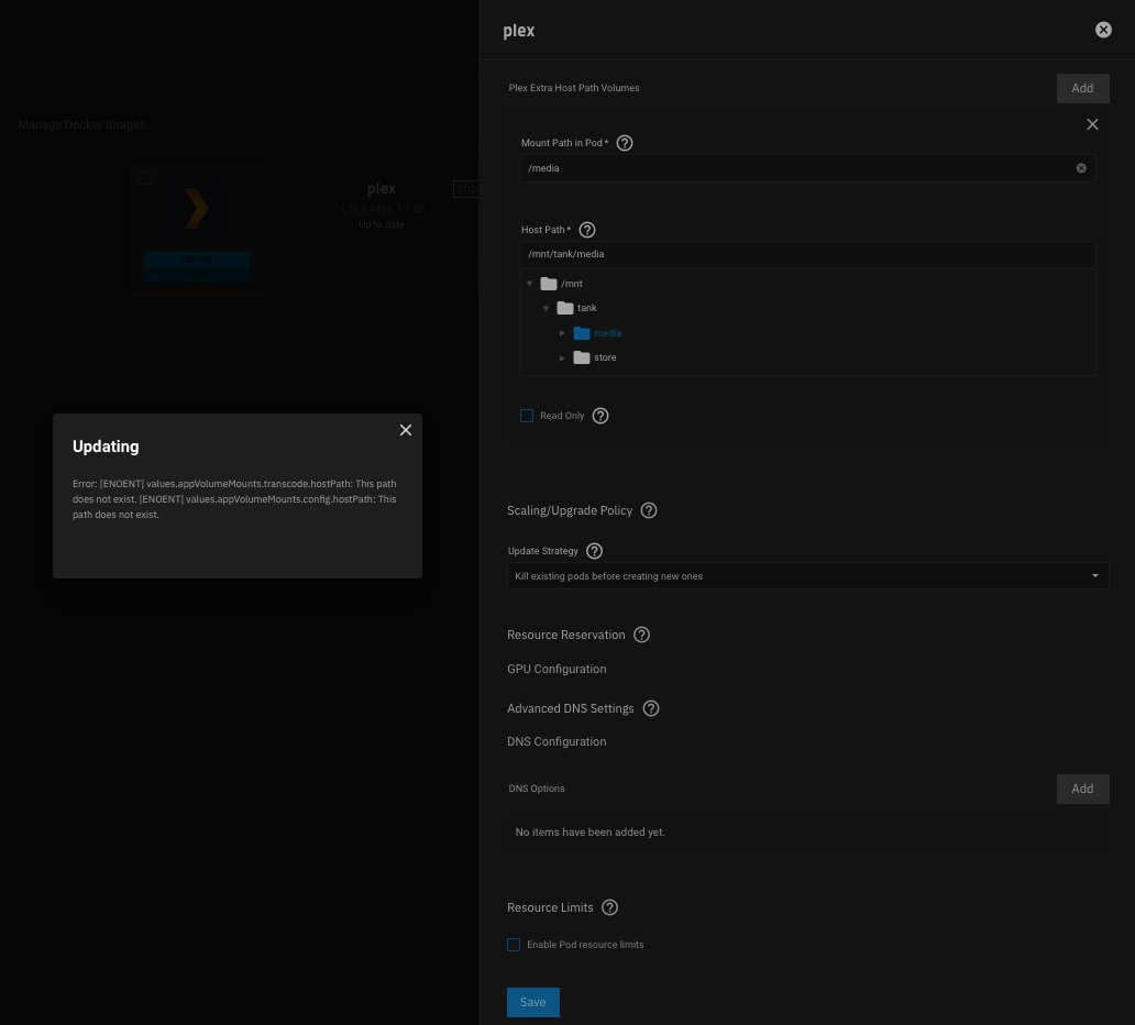 I've been running Scale/Angelfish from the start and used Plex. Just updated to Bluefin, all good 'except' Plex ... Hanging while deploying. I un-installed/deleted Plex, re booted the server and installed a fresh Plex. Plex is now 'Active' and I can launch the web portal, my libraries do not show, so under Settings / Manage / Libraries / Add Library - choose option ... Browse for media folder. I get what I think is the contents of the Plex App (see attached screen-shot)? I have looked through all the Bluefin settings/permissions, all seem correct. I'm at a loss and cannot find others with the same or similar issue. Thanks.