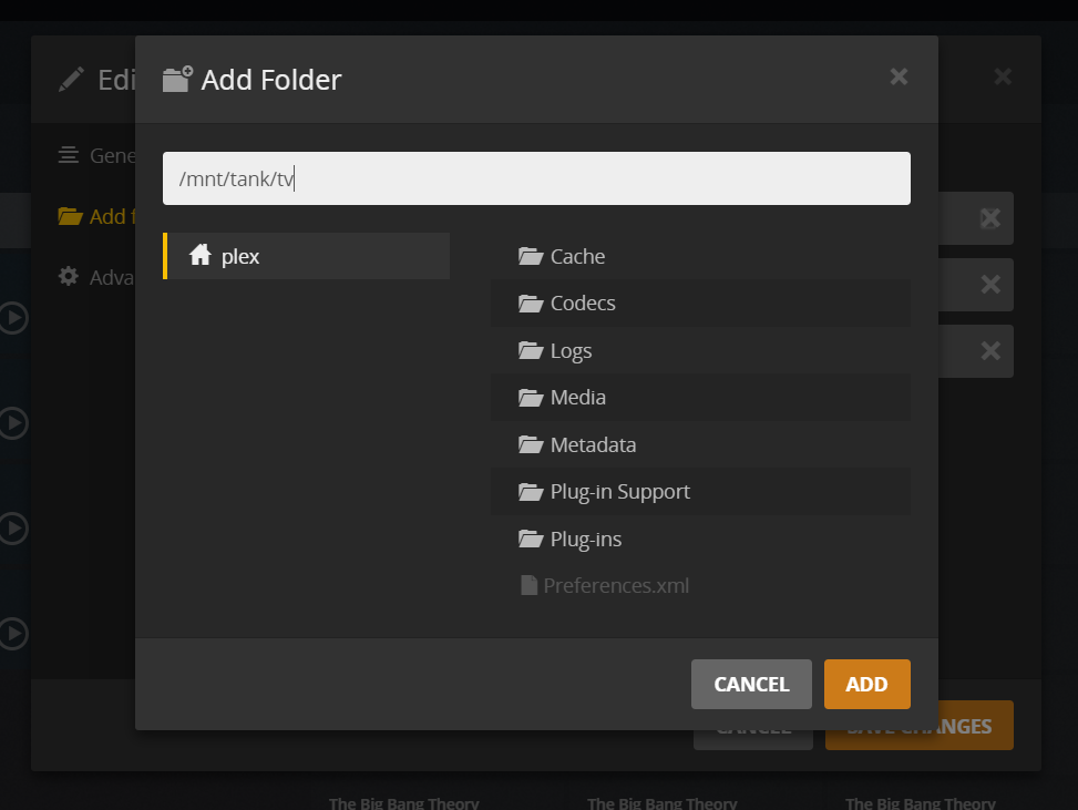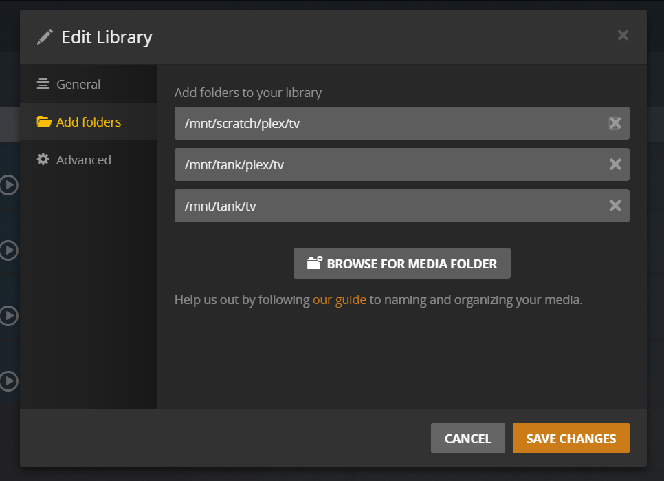 In my case, these are the storage source and destinations for my Plex jail. From the Plex web UI, I would add /mnt/scratch/plex/tv and so forth for the rest of my media sources.