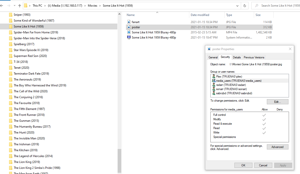 On TrueNas 12.0-U1, Sabnzbd 3.0.2, Radarr 0.2.0.1504 I am having an issue with the completed downloaded files on my media dataset where the video file throws an error "the permissions on ...... are incorrectly ordered". Yet the jpg and nfo files in the same folder have no such issue. When I do a properties on them via windows 10 on the share for windows.