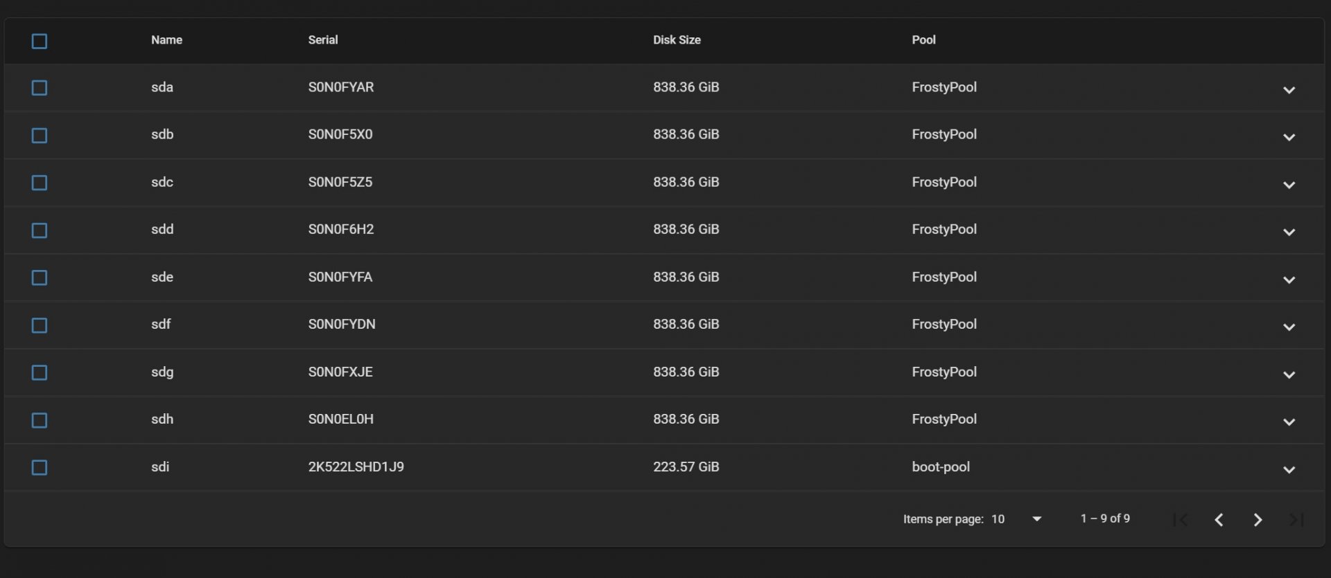 Please see below for the details of my pool and disks, I don't have any cache or logs, last disk is a 128Gb ssd connected via sata and it's used for boot!