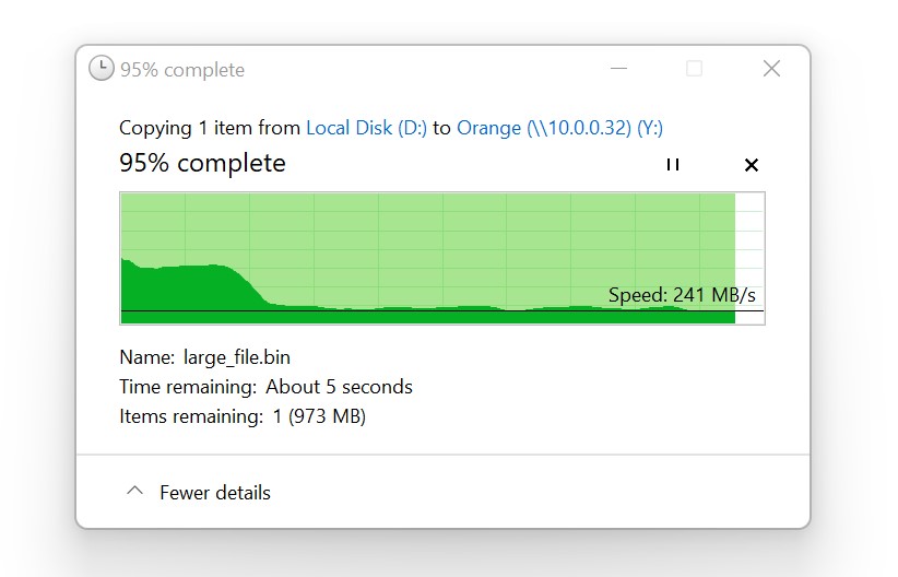 However when I try to write to NAS, through SMB and Windows 11, using a 20GB file it starts good, with the speed of 1GB/s then it drops to about 200MB/s. If I try to copy large number of small files then it goes down to 1 MB/s extremely slow!