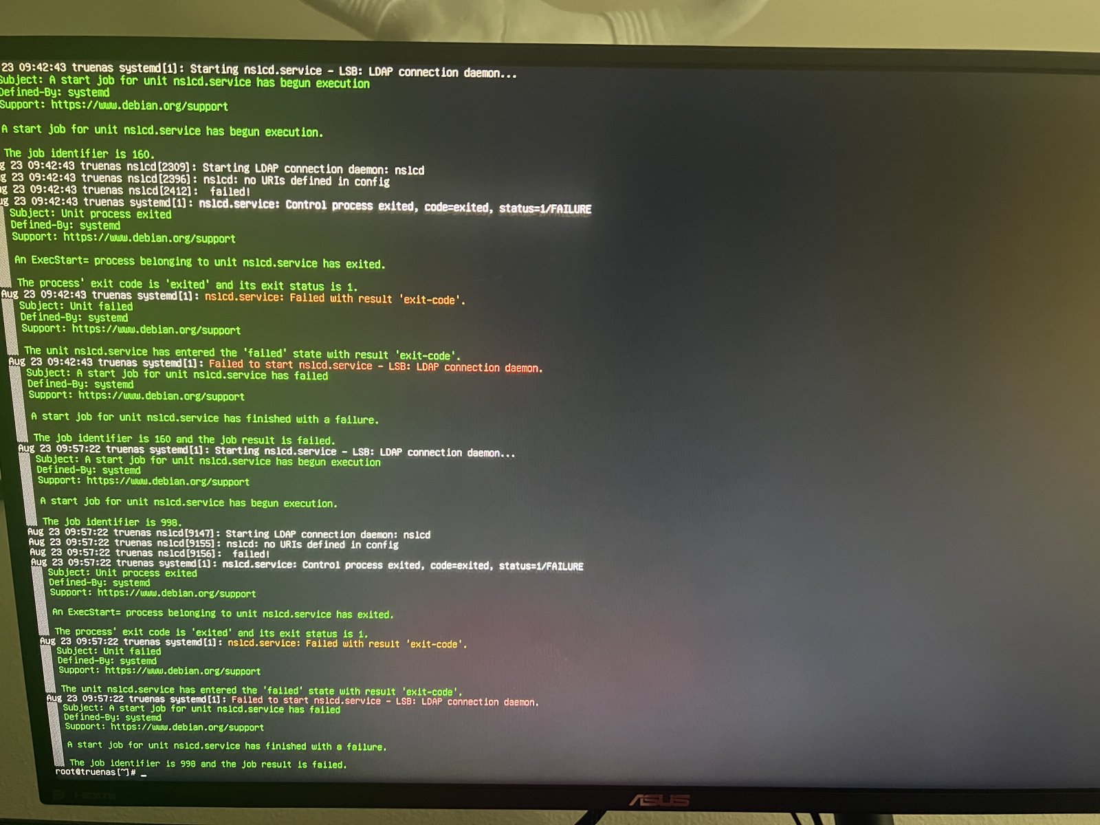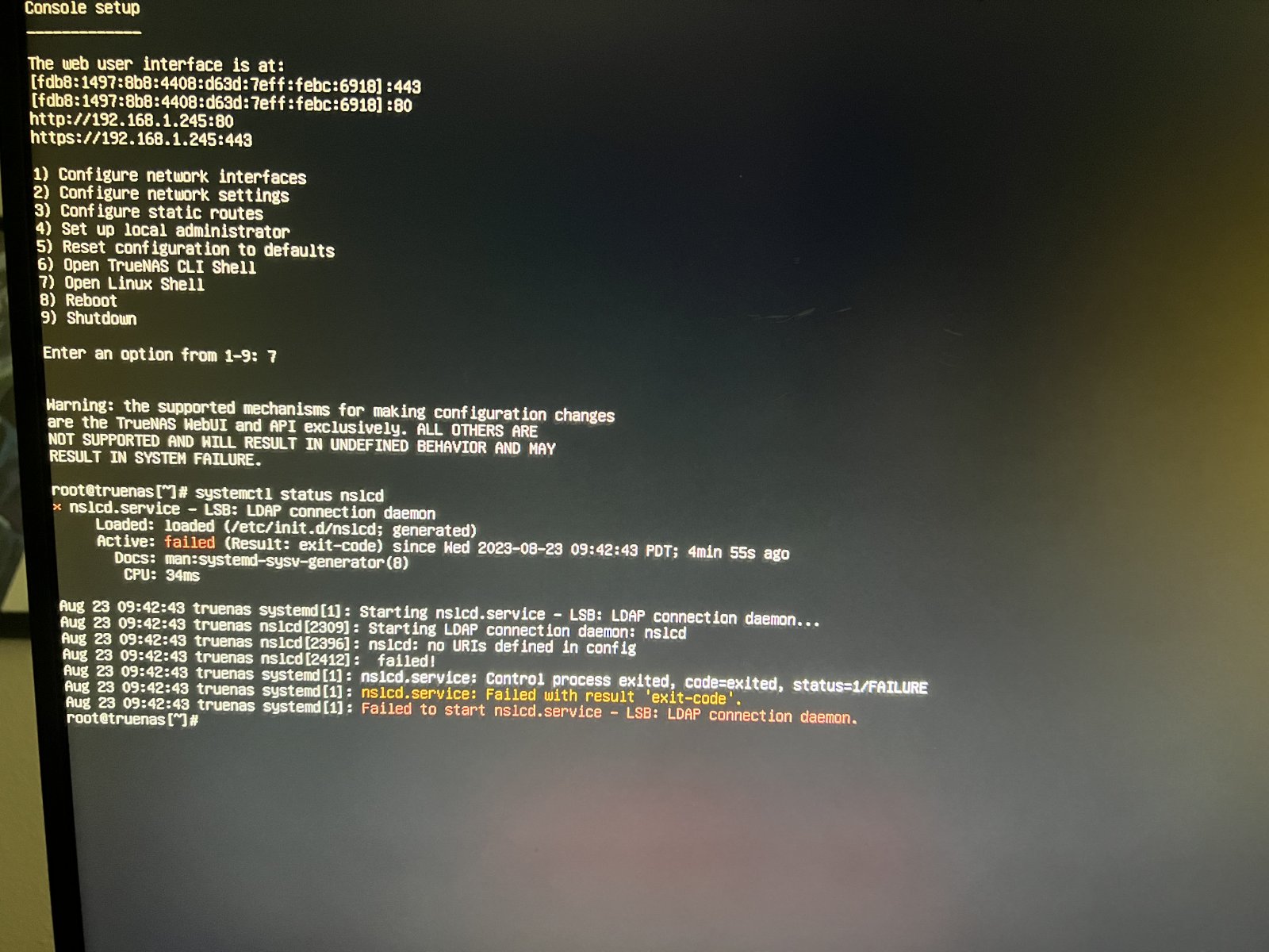 Hooking up an external monitor, I was shown a “Failed to start nslcd.service - LSB: LDAP connection daemon.” With further digging, I found “nslcd.service: failed with result ‘exit-code” and “nslcd: no URIs defined in config”. Despite re-installing the TrueNAS os onto the boot drive and trying on another drive, it still fires these same errors.