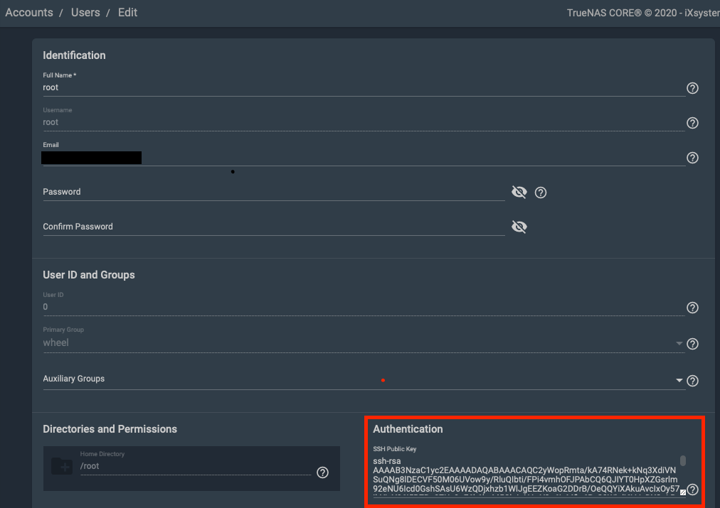 Then in the section Importing your SSH key simply ignore all the stuff about the Joyent portal. Instead open up the menu "Accounts -> Users" on your NAS and edit the "root" user. Then paste the public key that you copied to the clipboard with thatpbcopycommand in the instructions into the corresponding field of the root account. Save - done.