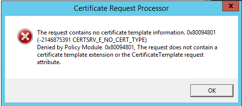 Was wondering if anyone has been successful in generating, signing and applying an SSL certificate from a Windows Certificate Authority for FreeNAS to utilize as an SSL cert (internal only) , the attached photo is the error I receive when trying to submit the request , it looks like its in reference to a missing attribute.