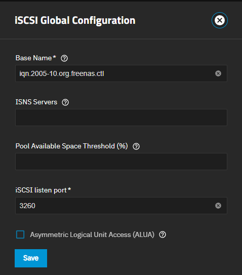 Click on the iSCSI widget header to open the Sharing iSCSI screens. Click on Global Target Configuration. Scroll down and select Asynchronous Logic Unit Access (ALUA), then click Save.