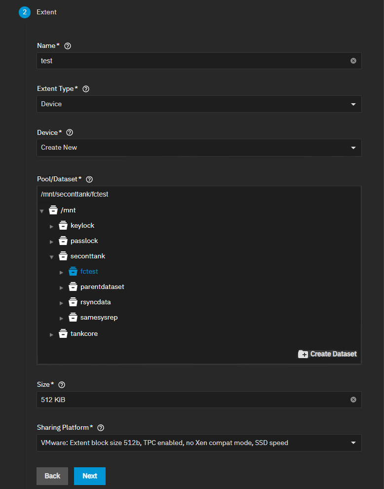 The wizard provides an option to create a dataset on the Extents screen when adding the device. Selecting this option creates a dataset for organizational purposes and a zvol of the same name for block storage.