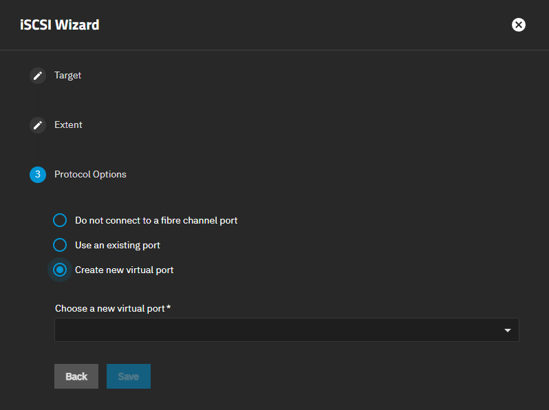 Select the protocol option for your use case. When installing iSCSI fibre channel ports the first time, select Create new virtual port.