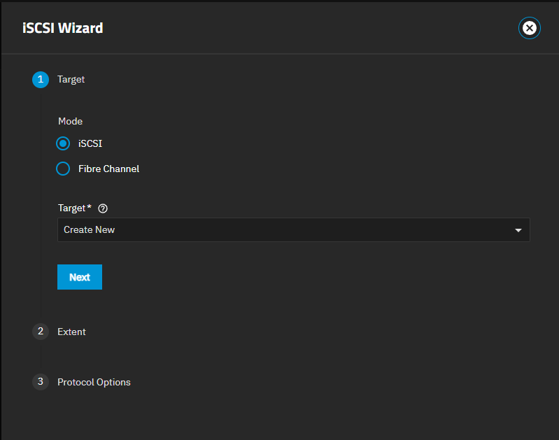 Next and for all systems, go to Shares and click Wizard on the iSCSI widget to open the wizard.