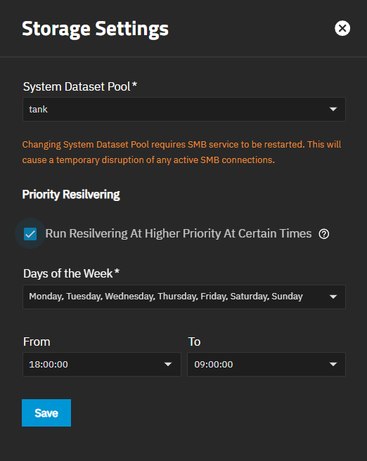 To set a different resiliver priority, select Run Resilvering At Higher Priority At Certain Times. Two additional setting options show that allow you to configure the day and time range for resilvering to run.