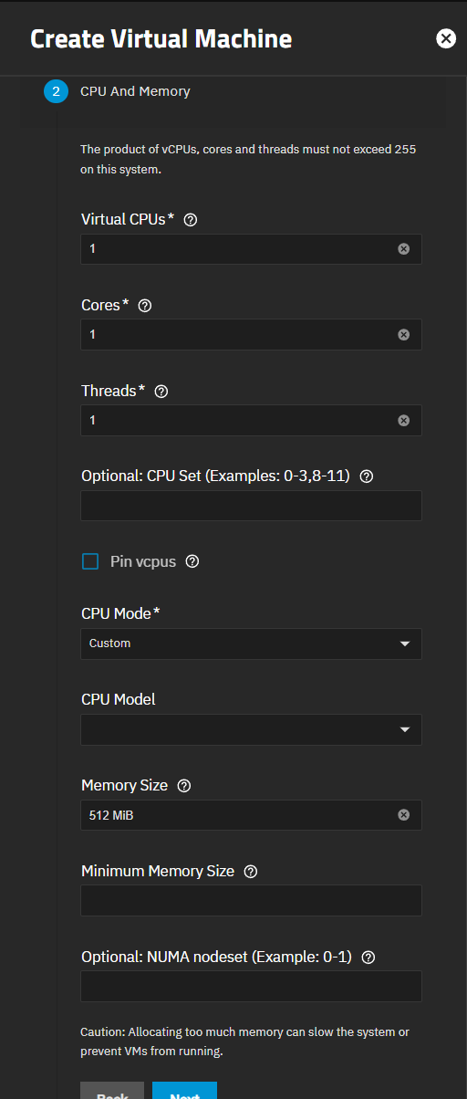 Compare the recommended specifications for the guest operating system with your available host system resources when allocating virtual CPUs, cores, threads, and memory size.