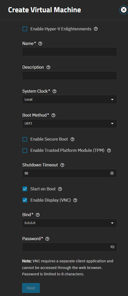 h. (Optional) Select Enable Display (VNC) to enable a Virtual Network Computing (VNC) remote connection for the VM. Enable Display (VNC) shows the Bind and Password fields.