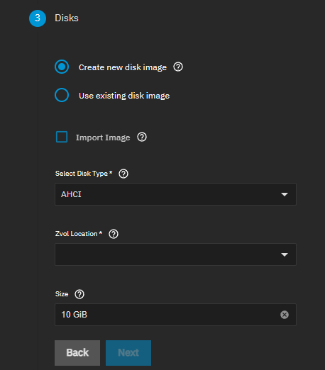When creating a new disk image, select the location for the new zvol from the Zvol Location dropdown list and enter a value in Size (Examples: 500KiB, 500M, and 2TB) to indicate the amount of space to allocate for the new zvol.