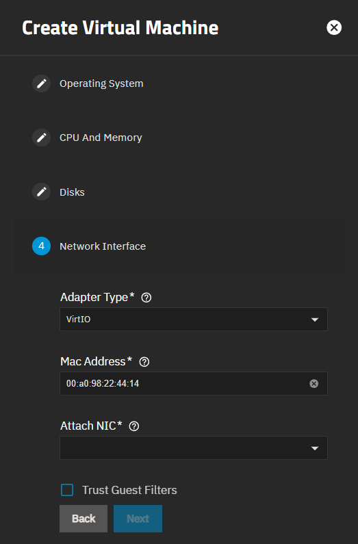 Select the network interface card to use from the Attach NIC dropdown list. If the VM needs to access local NAS storage, attach a network bridge interface.