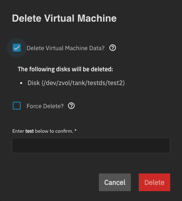 Deleting a VM with Delete Virtual Machine Data selected results in permanent data loss if the data is not backed up. Do not select this option if you want to keep the VM zvols intact for use with another VM or for data recovery.