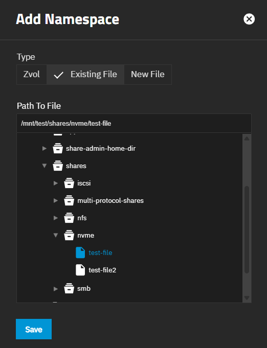 The Existing File tab on the Add Namespace allows selecting an existing file as a namespace. There are two Path to File fields: the blank field and the file browser field. The top blank field populates with the path for the existing file selected using the file browser field below it.