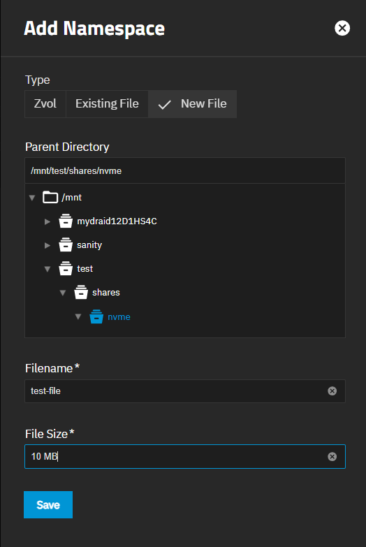 Add to the right of Namespaces on the What to Share option of the Add Subsystem wizard opens the Add Namespace screen. Add on the Namespaces widget on the NVMe-oF screen opens the Add Namespaces screen.