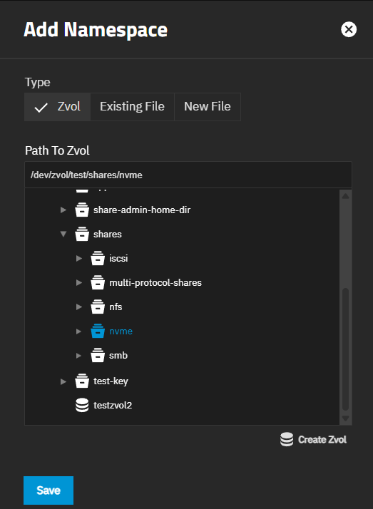 The Zvol tab on the Add Namespace screen allows selecting an existing or creating a new zvol namespace. There are two Path to Zvol fields: the blank field and the file browser field. The top blank field populates with the path for the existing zvol or parent dataset selected using the file browser field below it.