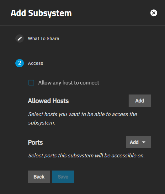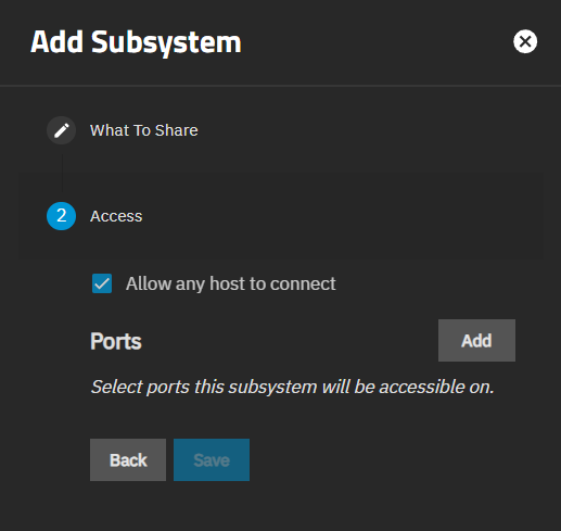The Access screen in the Add Subsystem wizard allows configuring hosts allowed to connect to the subsystem and ports the target uses to communicate with hosts.