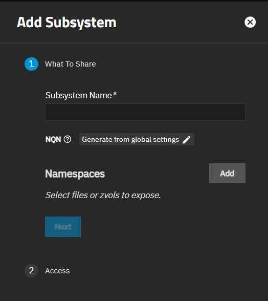 The Add Subsystem wizard opens after clicking Add on the NVMe-oF Subsystem widget or Add Subsystem on the NVMe-oF screen. The wizard has two parts, What to Share and Access. What to Share shows by default.