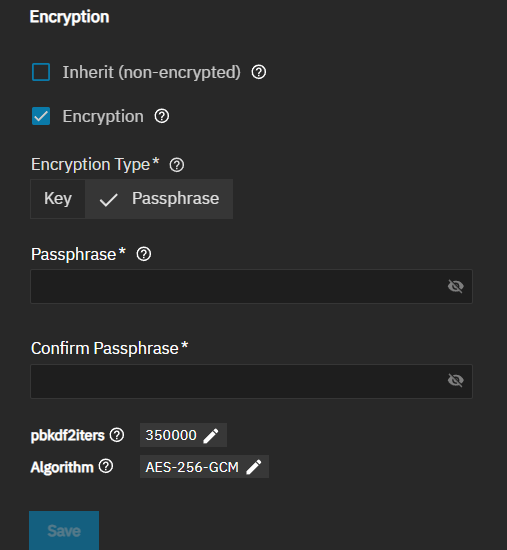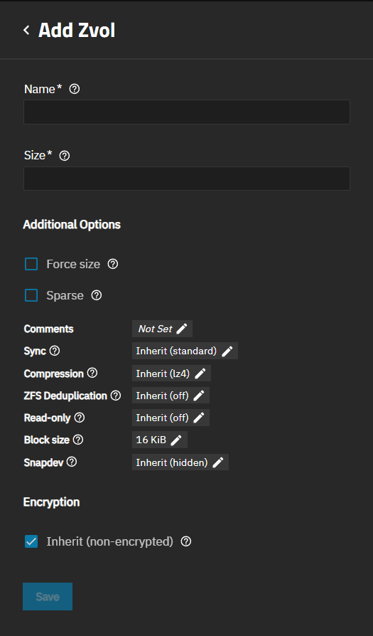 Encryption settings secure data within this zvol. These settings establish the level and type of encryption applied. The default setting is Inherit (non-encrypted) when the root or parent dataset for the new storage is unencrypted. If encrypted, this shows Inherit (encrypted).