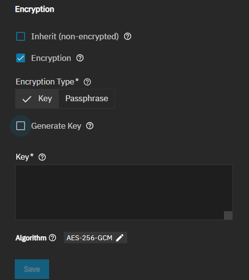 The Key settings accept a system-generated or user-entered encryption key. Creating a new key file invalidates the previously downloaded key file associated with this dataset. Shows with Generate Key selected by default. This automatically generates an encryption key for the zvol. Clearing the checkmark shows the additional key encryption settings.