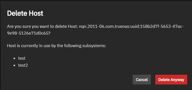 The Delete Host confirmation dialog deletes the host(s) from the listed subsystems(s) listed in the dialog and from TrueNAS.