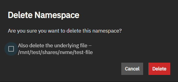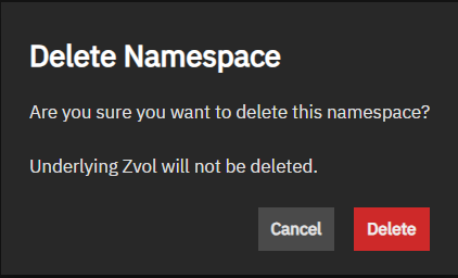 The Delete Namespace opens after clicking the delete icon to the right of a zvol on the Namespaces widget.