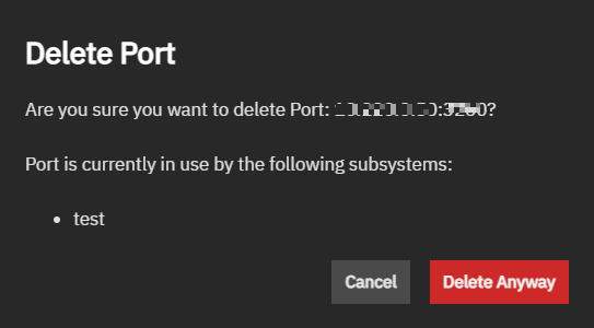 Cancel closes the dialog without removing the port from the subsystem. Delete Anyway removes the port assignment from the subsystem specified in the dialog.