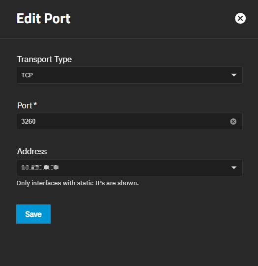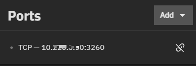 After removing a port, the Add button dropdown list shows the removed port and all available ports on the system in the format IP address:port.