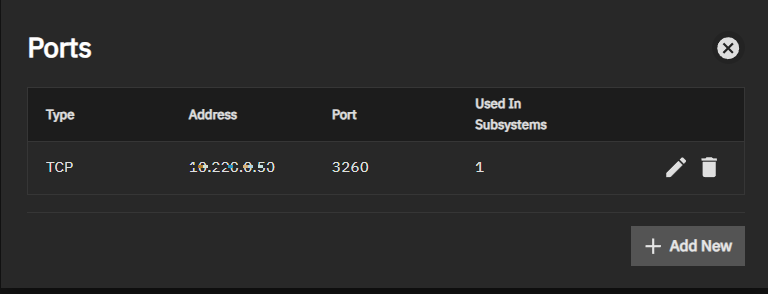 The Add Port Screen shows settings to add or select a port to associate with the subsystem. Ports are formatted as IP address:port. 4420 is the default port number, commonly selected for NVMe-oF with IP addresses, and we recommend using this port rather than adding a custom port.