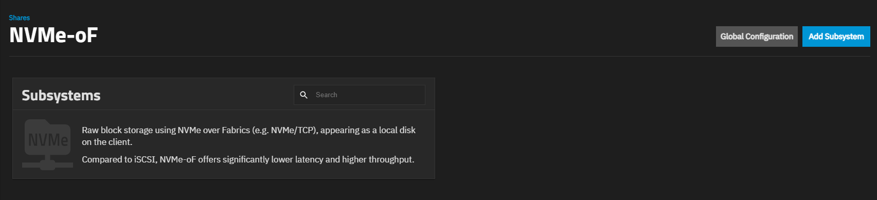 Before adding an NVMe-oF subsystem, the NVMe-oF screen shows a general widget with information about subsystems and a basic comparison to iSCSI.