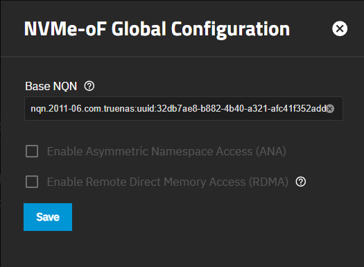 - Config Service that opens the NVMe-oF Global Configuration screen. You can access this configuration screen by going to System > Services or using the Global Configuration button on the NVMe-oF screen.