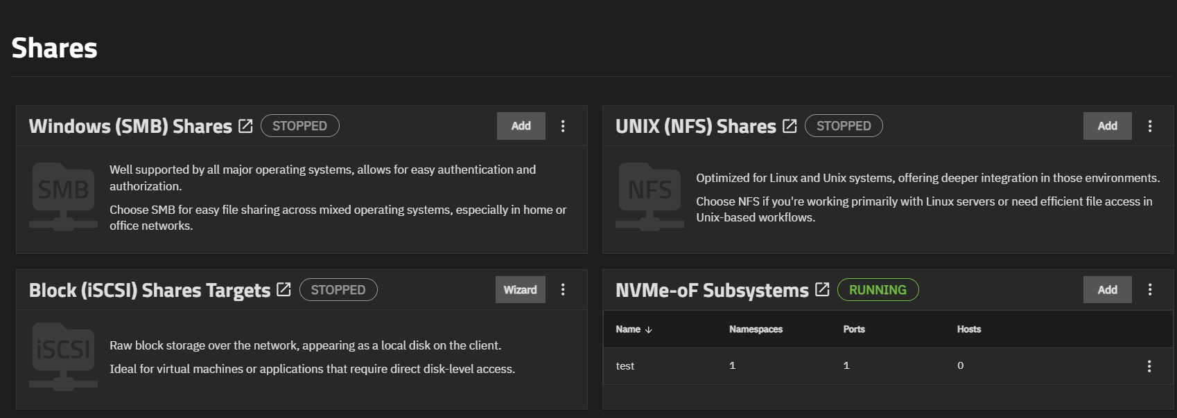 The NVMe-oF Subsystems widget shows on the Shares screen. The header shows the status of the NVMe service as Stopped or Running, the Add button, and the dropdown menu with two options: