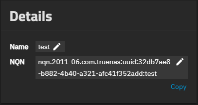 The Details widget shows the name and NQN ID associated with the TrueNAS subsystem. The NQN shows an edit icon that changes the NQN to a text-entry field.