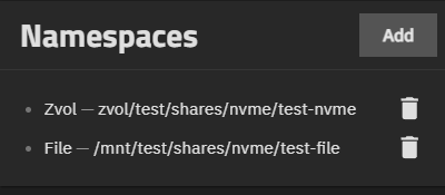 The Namespaces widget lists namespaces (zvol or file) added to the subsystem and the path to it. Namespaces are similar to iSCSI extents.