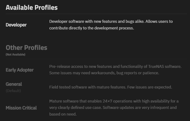 | Mission Critical | Available to Community and Enterprise users, especially TrueNAS HA systems. This profile is the most conservative release, and is mature software that enables 24x7 operations with high availability for a clearly defined use case. Software updates are very infrequent and based on need. |