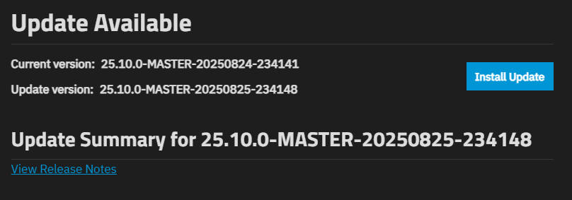 If an update is detected, it and the Install Update button show below the current release version. The update summary for this release shows the View Release Notes link that opens the release notes for the update version.