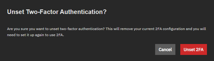 Are you sure you want to unset two-factor authentication? This will remove your current 2FA configuration and you will need to set it up again to use 2FA.