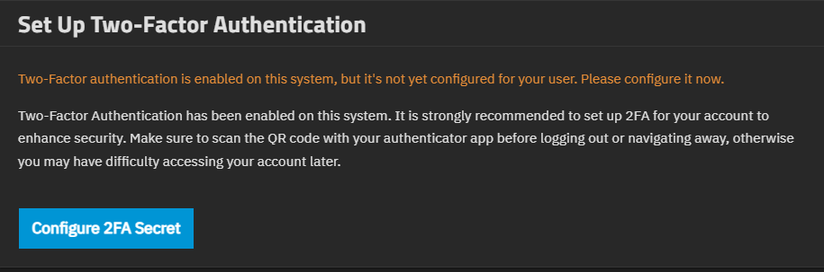 Two-Factor Authentication has been enabled on this system. It is strongly recommended to set up 2FA for your account to enhance security. Make sure to scan the QR code with your authenticator app before logging out or navigating away, otherwise you may have difficulty accessing your account later.