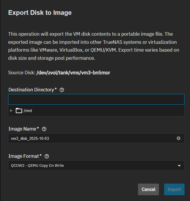 Export to Image - Shows only for disk devices. Opens the Export Disk to Image window to convert the disk (zvol) to a portable disk image file in QCOW2, QED, RAW, VDI, VHDX, or VMDK format.