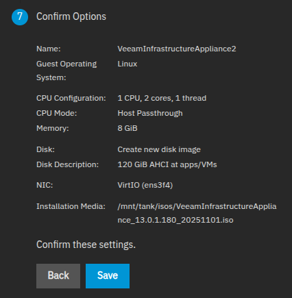 Configure a TrueNAS VM that meets or exceeds the minimum Veeam requirements and use the correct ISO image. This zvol created with the VM is Disk 1 from the appliance requirements. Do not start the VM yet.