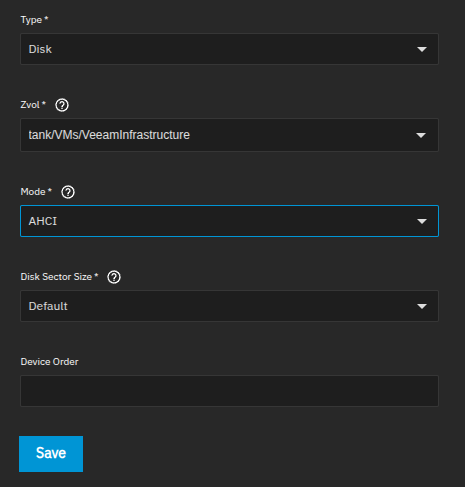 Go to the Virtual Machines screen and expand the newly created VM entry. Click Devices > Add to see the Add Device screen. Add the newly created zvol as a disk in AHCI mode. All other settings can remain at their defaults.